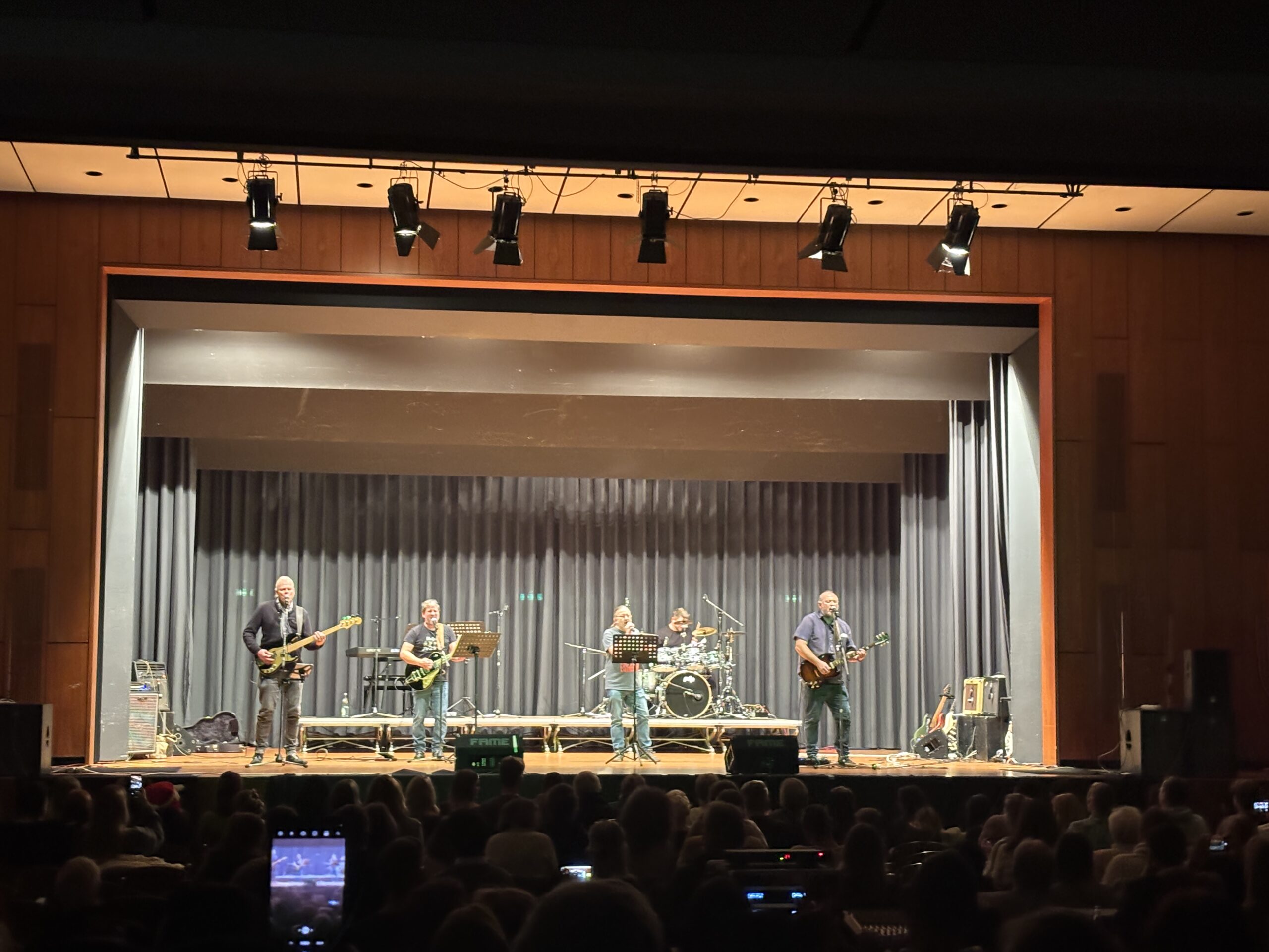 Der Abend begann mit einer Begrüßungsrede von Herrn Güting, der das Publikum als Gastgeber willkommen hieß. Anschließend betrat eine Band aus der ehemaligen Q2 die Bühne und sorgte direkt für mitreißende Stimmung. Danach folgte eine weitere Band aus der aktuellen Q2, die das Publikum ebenfalls begeisterte. Ein besonderes Highlight war der Auftritt der Gruppe Guardians of the Glam, die das Publikum gemeinsam mit Herrn Spittank musikalisch in die 70er-Jahre entführte. Nach einer kurzen Pause ging es weiter, als eine andere Band aus der Q2 die Bühne übernahm. Im Anschluss rundete der Schulchor das Programm ab. Den Schlusspunkt setzte Frau Hautkappe. Dieser Abend machte deutlich, wie viel Talent und Teamgeist in unserer Schule steckt. Das Abikonzert 2025 war nicht nur ein musikalisches Erlebnis, sondern auch ein wunderbares Zeichen für Zusammenhalt und Kreativität.